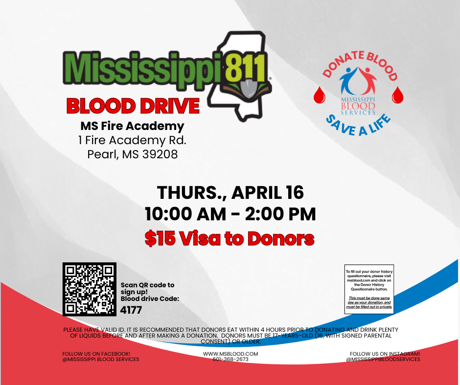 April National Safe Digging MonthEvent: Safety City/Blood Drive When: Thursday, Apr. 16 Time: 10am-2pm Where: MS Fire Academy @ 1 Fire Academy Rd, Pearl, MS Contact Information SurveyNeed to make changes to your contact info? Take a quick moment to verify or update it! Click Here SammySafety is in your Hands! Every Dig! Every Time! Excavators Facility Owners Homeowners